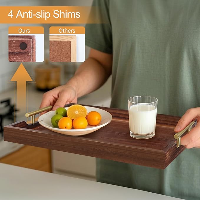 - [WHO DOESN'T LOVE HANDCRAFTS?] Have to say our rectangle wood serving tray is so functional and stylish at the same time. Every paint process is completed by our hard workers, who aim to make each beautiful tray to prevent splinters, paint chips, and scratches. It's lightweight but sturdy enough to be used as a coffee table tray for the living room.