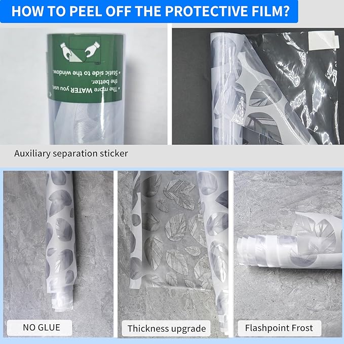 - [Installation Tips]: Please make sure that the surface, edges and corners of the window are clean enough without any dust, and remember to remove the transparent back film before installation; During installation, spray plenty of water on the surface of the window and on the back of the window privacy film to ensure effective adhesion! Note: Not for use with frosted, cut or machined glass that does not have a smooth surface