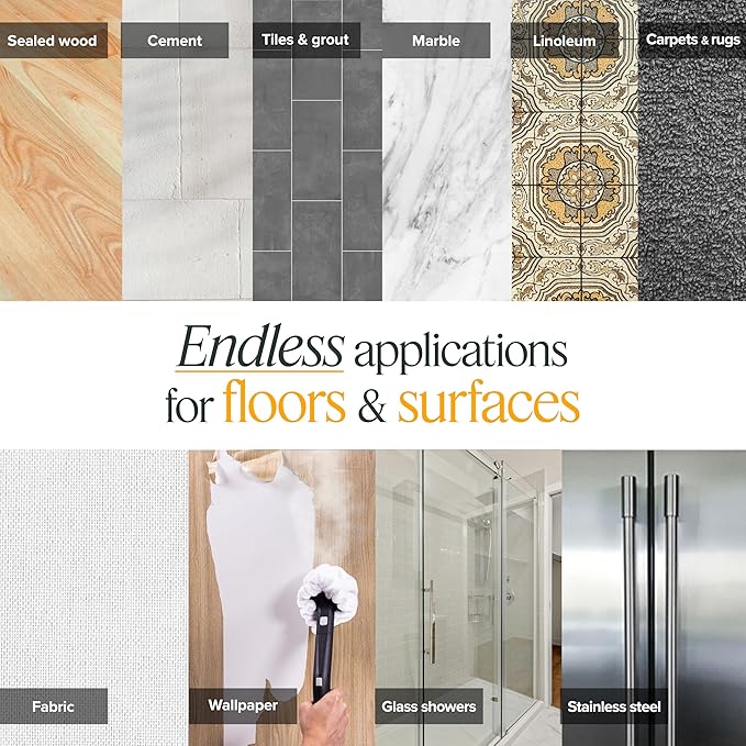 - Powerful Steam Cleaning: Generates superheated steam to break down stubborn dirt, grease, and grime effortlessly, delivering a deep, chemical-free clean on a variety of surfaces. Clean. Sanitize. Refresh. Detail. Deodorize. Multiple surfaces, naturally