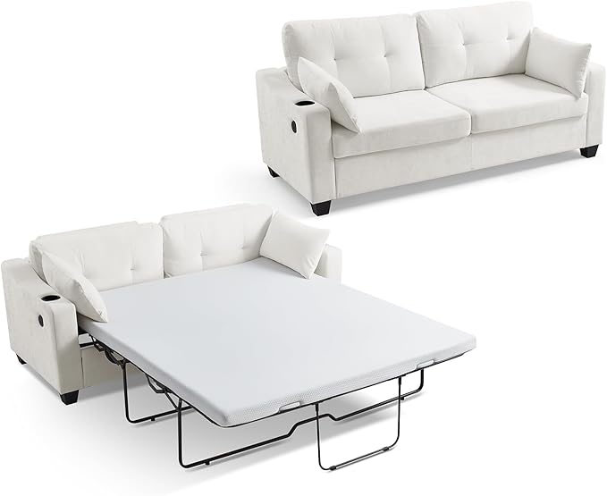 CHIC HOUSE Pull Out Sofa Bed, Full Size Sleeper Sofa, 2-in-1 Convertible Chenille Couch with USB Charging, Memory Form Corduroy Couch for Living Room, Apartment & Small Space (Beige, Chenille - Queen)
