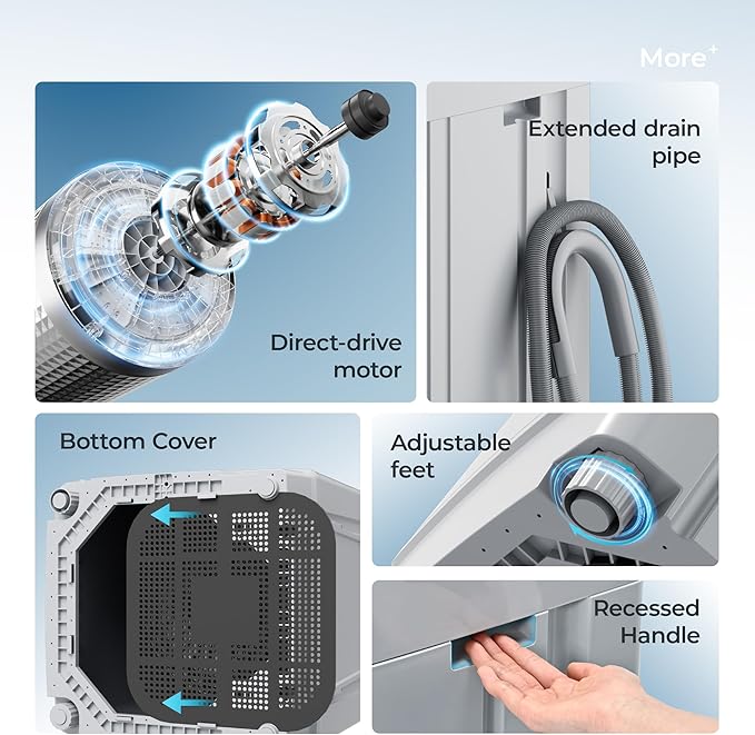 - More considerate design: Long press the "Program" and "Delay" buttons at the same time to turn on the child safety lock function of the washing machine. At this time, pressing other buttons will not respond, reducing the risk of injury. The adjustable non-slip feet enable the top load washing machine to maintain horizontal balance even on uneven floors and will not be easily overturned by external forces.