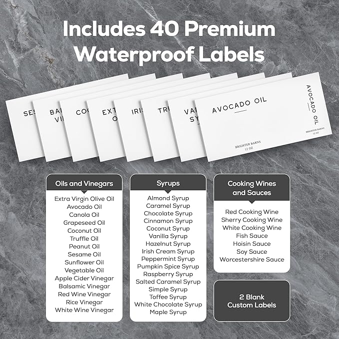- AMERICAN DESIGN, UNCOMPROMISING QUALITY – Crafted with meticulous attention to detail, our cooking oil dispenser set features shock-resistant glass, 40 premium waterproof labels, and high-quality weighted 304 stainless steel spouts that automatically close to preserve freshness and prevent messes. All designed in the USA to provide unbeatable quality and enduring style that you can trust.