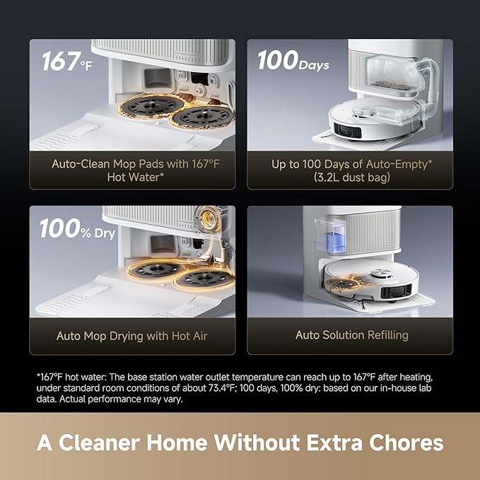 - All-in-One PowerDock Convenience: Skip manual dust box emptying for up to 100 days with L40s Ultra, when it also rinses mop pads with 167℉ hot water and dries them. Plus, it refills solution and water for mopping and washes the board with little residue for a truly hands-free post-cleaning.