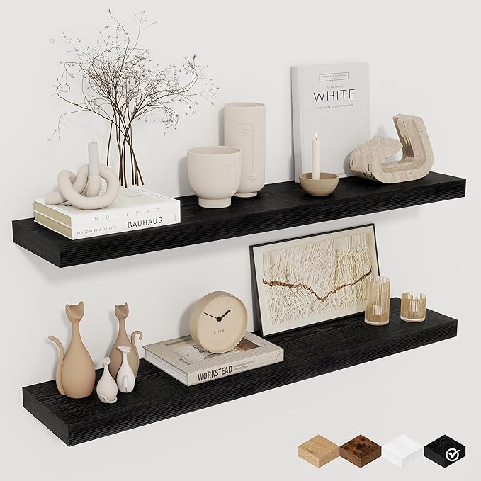 Fun Memories 32Inch Floating Shelves for Wall 2 Pack Wood Shelves for Kitchen, Bathroom, Bedroom Wall Mounted Rustic Wood Floating Shelf with Invisible Brackets for Books, Storage, Decor, Black