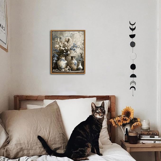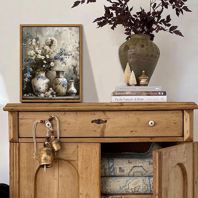 - Framed Canvas Wall Art: This vintage farmhouse floral canvas features elegant blue and white flowers in a charming art jar, capturing a timeless rustic beauty. It’s the perfect accent to enhance your living room, bedroom, bathroom, or any cozy home corner.