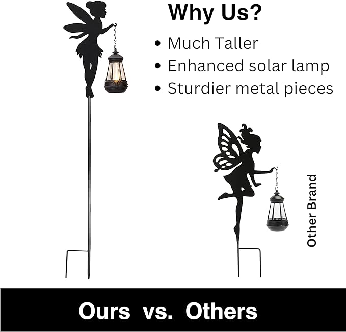 - 【 Tall Metal Solar Stakes 】Differing from other Fairy Statutes Solar lights for decoration, these angel figurines lights offer much taller height as 39 inch. The fairy garden kit comprises two straight poles with screws on both ends and one pole with a stake.
