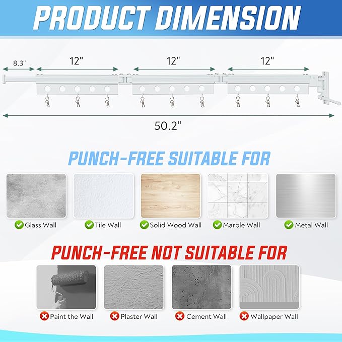 - Premium Material & Craftsmanship -- Crafted from space aluminum, our clothes drying rack wall mounted ensures long-lasting durability without rusting. Its multi-layered paint protection guarantees resistance to acids, alkalis, rust, and corrosion, ensuring robust performance over time.