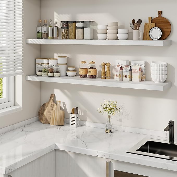 - Timeless Design for Any Room: Elevate your décor effortlessly! The classic retro texture of these floating shelves complements bathroom, bedroom, kitchen, living room or even office space. Neutral tones blend with existing furniture, adding warmth without clashing