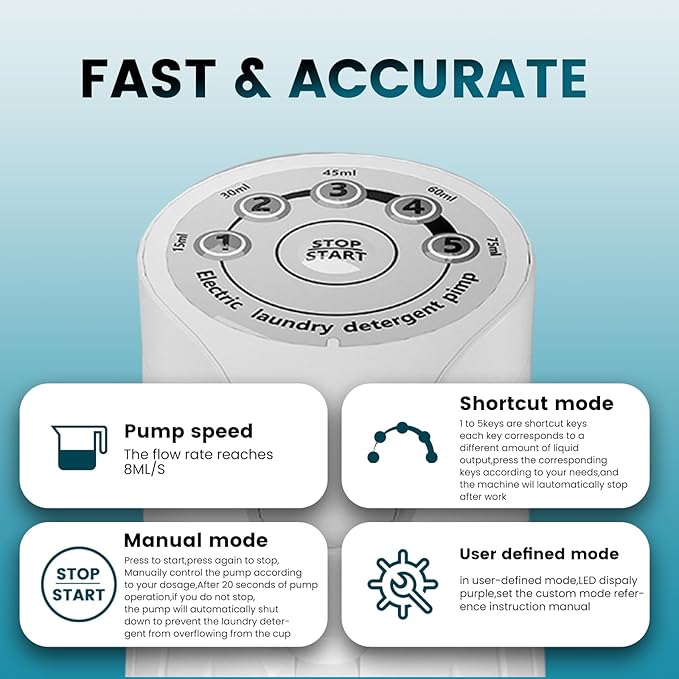 - New upgraded laundry detergent dispenser: Compared with traditional laundry detergent dispensers, this product is a smart electronic laundry detergent pump. The driving electronics can quickly draw the laundry detergent from the inlet tube into the measuring cup. The high-pressure pump provides 8 ml/s of detergent flow and has 5 adjustable modes to ensure that all wash amounts can get the best cleaning results while reducing residue and waste.