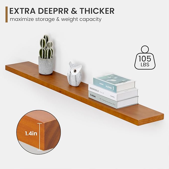 - Extra Deeper & Thicker for Storage - Each board measures 55"W x 8"D x 1.4"H. Extra deeper and thicker design in order to bring maximizes storage space and weight capacity, even hold up to 60 lb. This floating shelf taking up zero square feet, reduces clutter and highlights décor in compact spaces. It can help make full use of the empty wall, making it much more space-saving and making your room look larger and tidier.