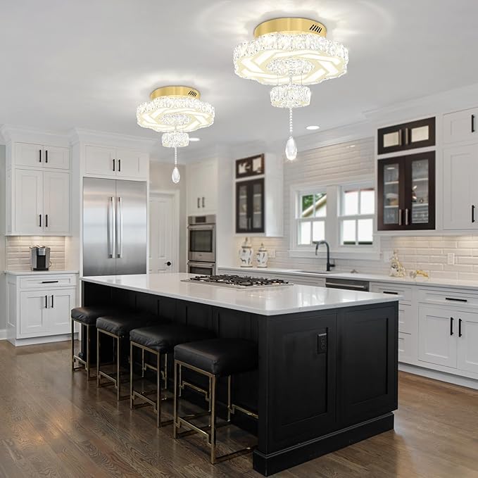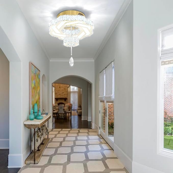 Flashing God 16 Inch Mini Chandelier Modern Crystal Chandeliers Light Semi Flush Mount Ceiling Light Fixture Small Gold Chandelier for Bedroom Hallway Kitchen Foyer