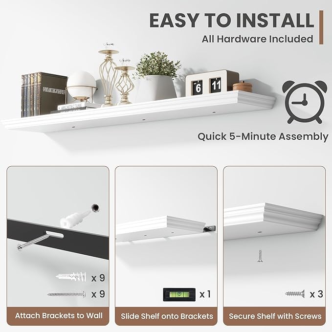- Package Contents: 1 white floating shelf included, board dimension: 55" Wide x 9.3" Deep x 1.5" Height. Other accessories: 1 metal brackets, 1 magnetic level, 3 wood iron connection screws, 9 wall screws and expansion tubes, and 1 installation manual
