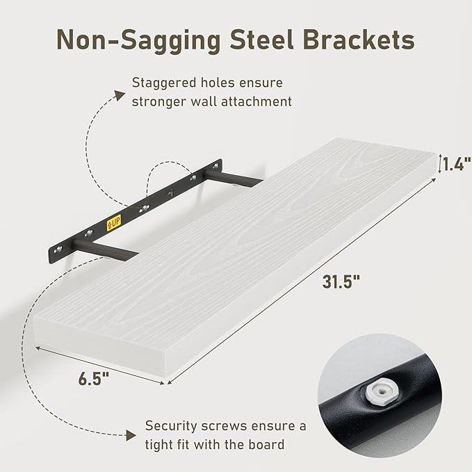 - 32 Inch Floating Shelves for Wall (Set of 3): Each wall shelves are 6.7 inches in depth and 1.4 inches in thickness. 3-piece set is more cost-effective and practical. Our wall shelf can be used in combination, staggered high or low on the wall, or mounted side-by-side to provide extra storage space for organizing small items and clutter in multiple areas such as kitchens, bathrooms, and bedrooms, creating a clean and smooth look. Multiple colors available