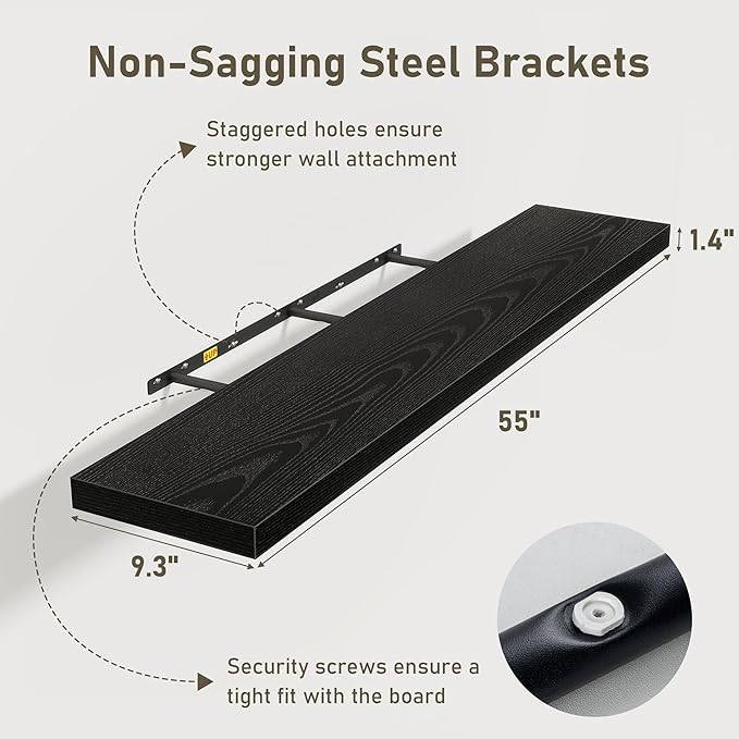 - 55 Inch Floating Shelves for Wall (Set of 2): Each wall shelves are 9.3 inches in depth and 1.4 inches in thickness. 2-piece set is more cost-effective and practical. Our wall shelf can be used in combination, staggered high or low on the wall, or mounted side-by-side to provide extra storage space for organizing small items and clutter in multiple areas such as kitchens, bathrooms, and bedrooms, creating a clean and smooth look. Multiple colors available