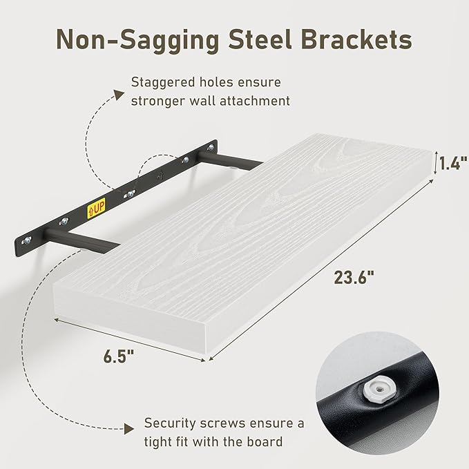 - Easy To Assemble: This floating shelves not only come with stainless-steel galvanized invisible brackets, but also equipped a fixing screw at the bottom to fix the shelf on the support rod, which solves the problem of sliding and is not easy to damage, and can be used for a long time. Instructions, magnetic level, drywall anchors, and screws included. This is great because you can easily mount these rustic shelves Gap-Free to any surface in less than 10 minutes
