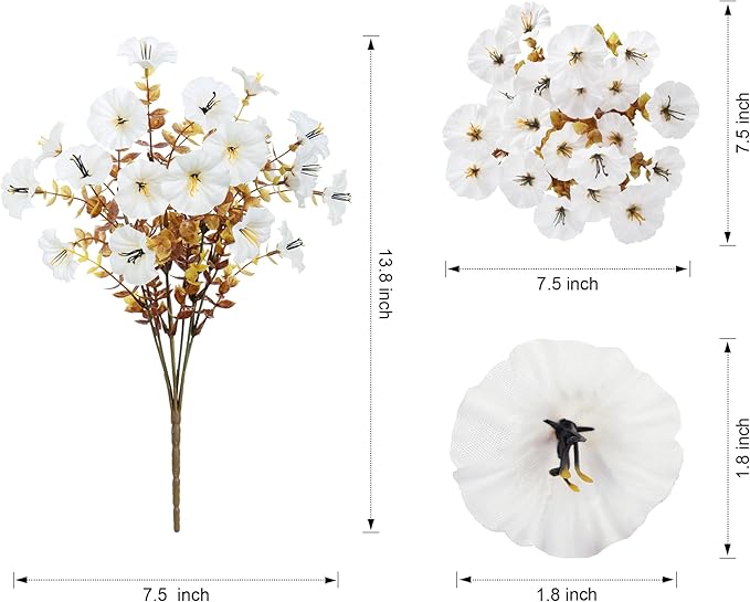 - Package Include: 12 bundles of artificial outdoor morning glory flowers with fall eucalyptus leaves. Pot not include.