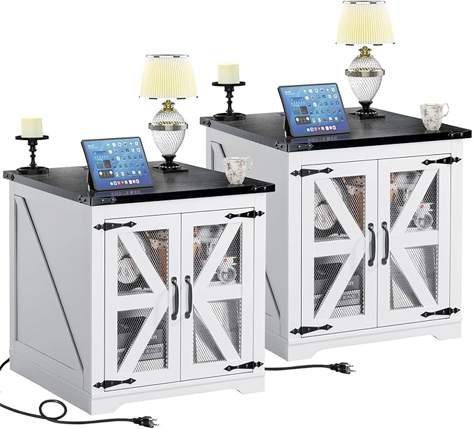 Farmhouse End Table Set of 2, 24" Large Sofa Side Table with Charging Station, Mesh Barn Door, White Nightstand with Adjustable Storage Shelf, Square Nightstand for Living Room, Bedroom