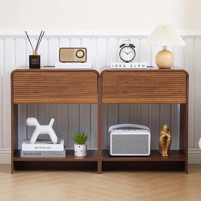 Fluted Nightstand Set of 2 with Charging Station, Modern Bed Side Table End Table with Drawer Storage, Large Wooden Night Stands Bedside for Bedroom Living Room Sofa Office, Walnut 2 Sets