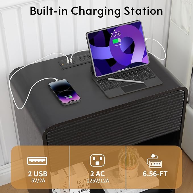 - 【Versatile Nightstand with Charging Station】Bedside Cabinet with 2 AC outlets & 2 USB ports conveniently located along the top, this nightstand has your charging needs covered. Measuring 20.86"W × 13.77"D × 24.8"H, our large nightstand provides ample storage space for all your bedside essentials. From books and reading glasses to electronic devices and personal items, everything can find its place within this spacious night stand. With its roomy desktop, large drawer, and open compartment, our bedside table allows you to keep your belongings tidy and within reach.