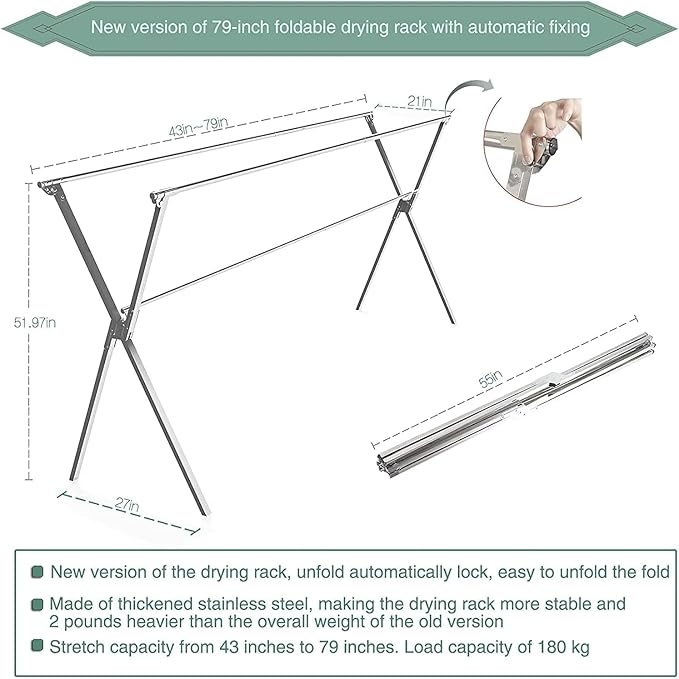 - Personalized Drying Space Configuration: Use year-round for drying and storage. Telescopic clothes drying rods can be easily adjusted to accommodate different needs. Lots of space for drying king-sized bedspreads, sheets, blankets, rugs, patio carpets, comforters, and large quilts. AZK foldable laundry rack is lightweight but sturdier than most portable dryers. Drying capacity of 250 pounds