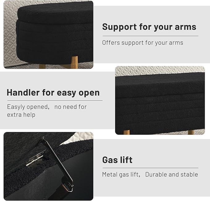 - ·Large Storage Space:This bedroom storage bench offers ample room to store blankets, toys, clothes, books, and more. The bench for end of bed helps you to keep everything organized. The four durable legs are crafted from selected solid wood for long-lasting use. The elegant black coating not only stabilizes the ottoman for bedroom but also safeguards the floor from scratches.