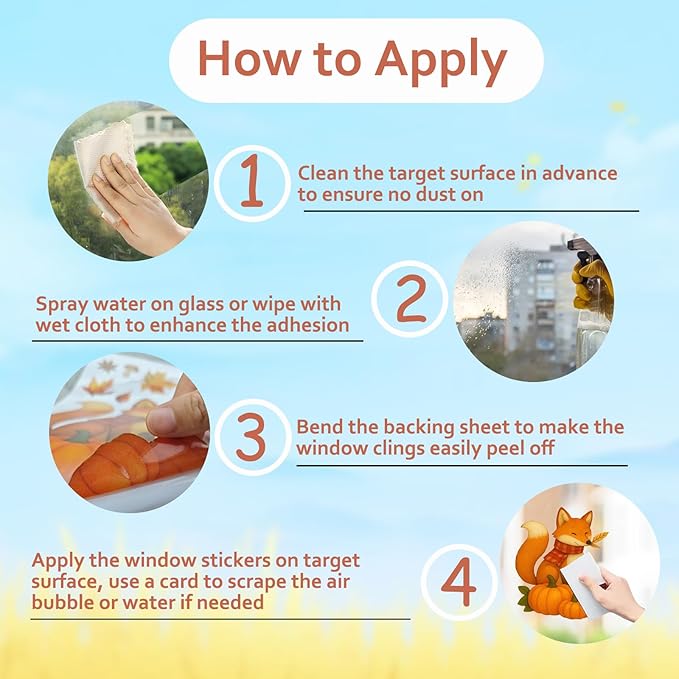 - 🌻Easy to Apply and Remove: Different from common window stickers with adhesion on, the static window clings is easy to be peeled off when you bend the edge of sticker on backing paper, then stick them on pre-treated window with wet cloth. No residue left on the glass when remove.