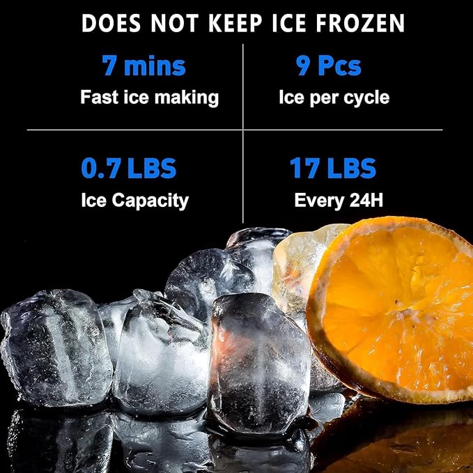 - BUILT-IN ICE MAKER: This machine makes its own bullet-shaped ice, and keeps it stored in an internal storage container ready to be dispensed instantly. It can store up to 0.65lb of ice but makes up 17.5 lbs of ice daily.(DOESN'T KEEP ICE FORZEN)