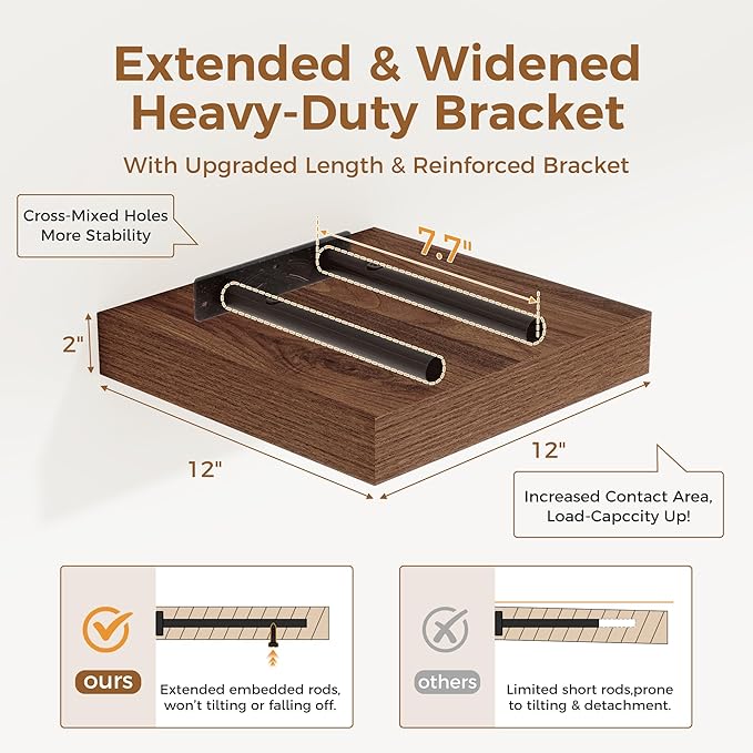 Fun Memories 12 Inch Floating Shelf, Rustic Wood Wall Shelves for Wall Decor & Storage, 12 x 12 Floating Shelf for Living Room, Bathroom, Bedroom, Walnut, Set of 2