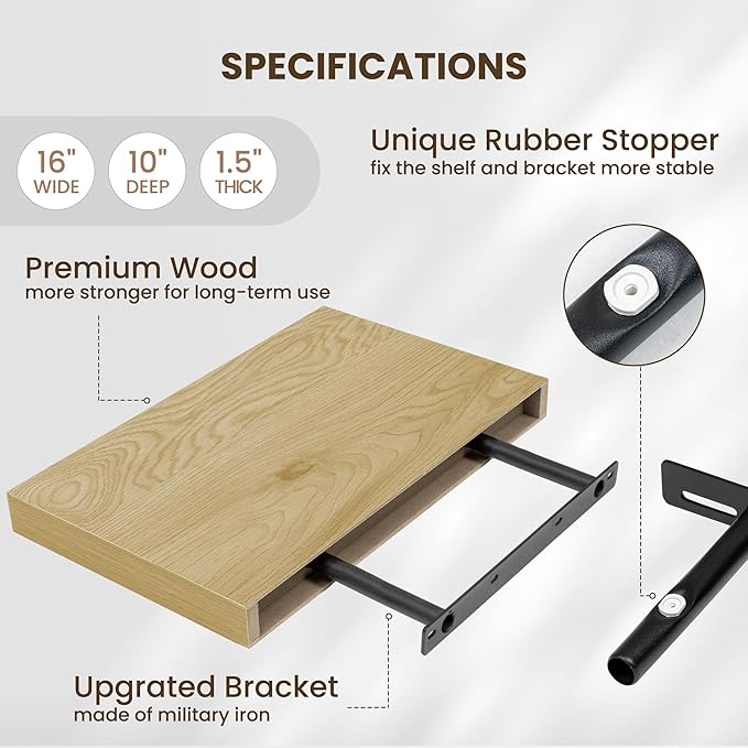 - INVISIBLE & STURDY BRACKET: This floating shelf features a simple and elegant design with an invisible bracket that creates a floating effect. The sturdy hidden support and special rubber stoppers ensure the shelf stays firmly in place, offering both strength and a clean, modern style