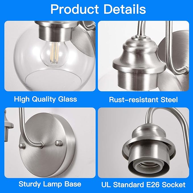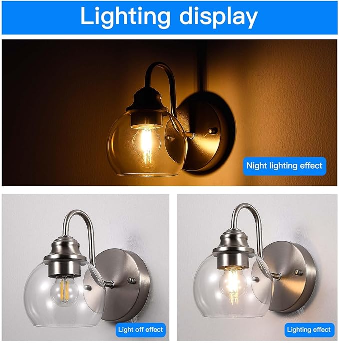 - [Excellent wall lamps]: Two sets of wall lamps are composed of transparent glass lampshades and metal bases. The transparent glass lampshades ensure good light transmittance. The gooseneck design not only restores the classic farmhouse style but also brings a touch of tenderness to your space, making it less rigid. The manufacturing process of brushed nickel metal paint ensures that the wall lamps will not oxidize or fade.