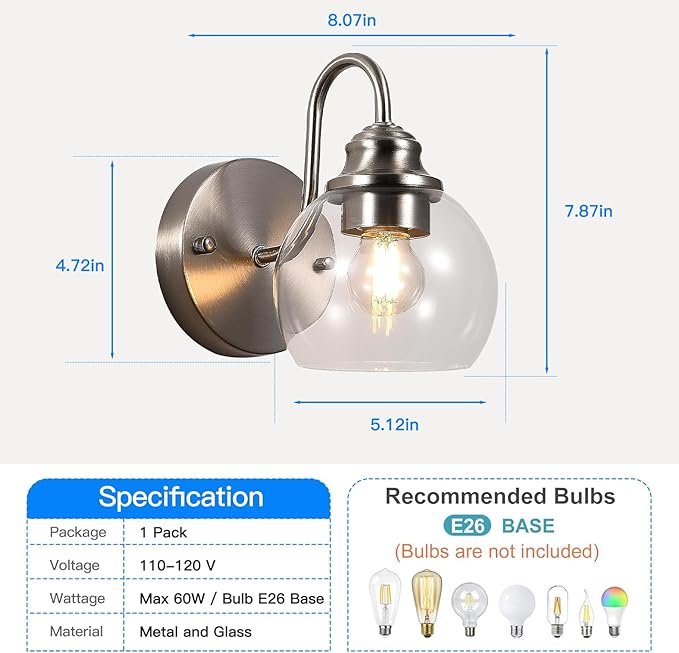 - 【Standard E26 Base】: Our bath vanity light fixtures set require 2 x E26 medium base bulbs (Max 60W for each light, Bulbs not included). This wall lamp areCompatible with smart bulbs and dimming bulbs (without smart and dimming functions). 2700K warm white bulbs brings you relaxing and welcoming feeling, however 5000K daylight white bulb give you clean and energetic enjoyment (Max. 60W, Hardwire 120V)