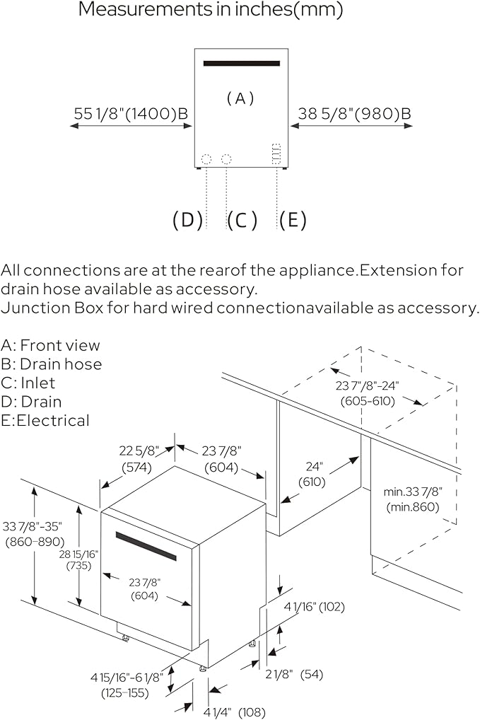 - Dimensions – 33 7/8" to 35” H x 23 7/8" W x 22 5/8" D; Cut-Out: 33 7/8" H to 35” H x 23 7/8" to 24” W x 24" D