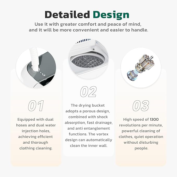 - [Powerful Performance+Sterilization Design] The portable washer machine adopts a newly upgraded copper core motor, providing a high speed of 1300RPM, 250W washing power+140W dehydration power, effectively removing stains. The silver ion penetration technology on the barrel wall deeply cleans the fibers of clothing, protecting your clothing health.